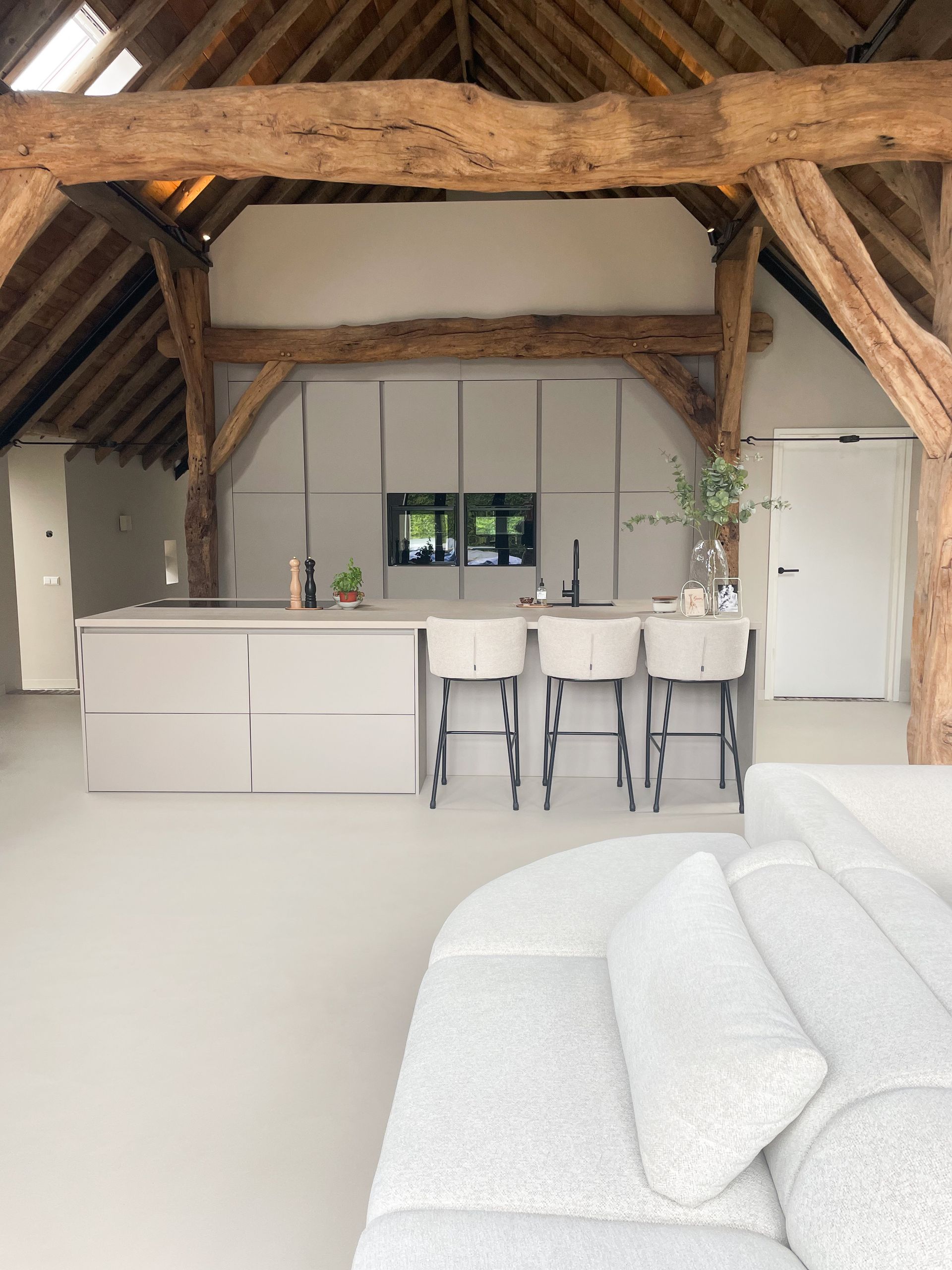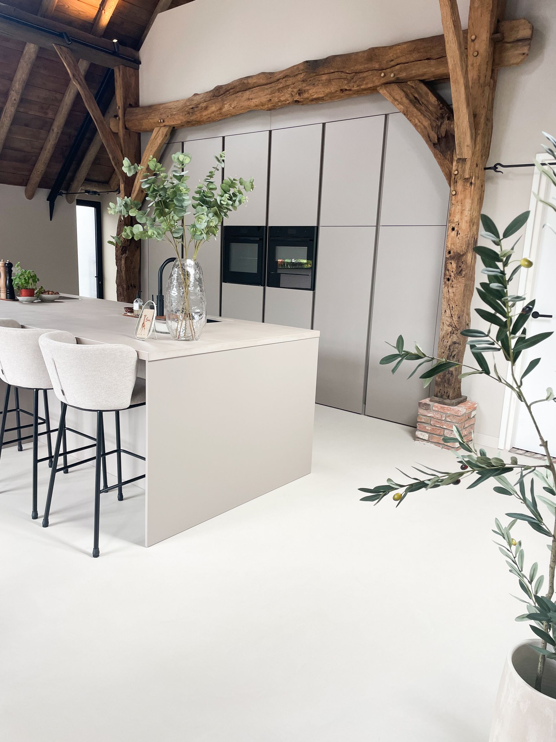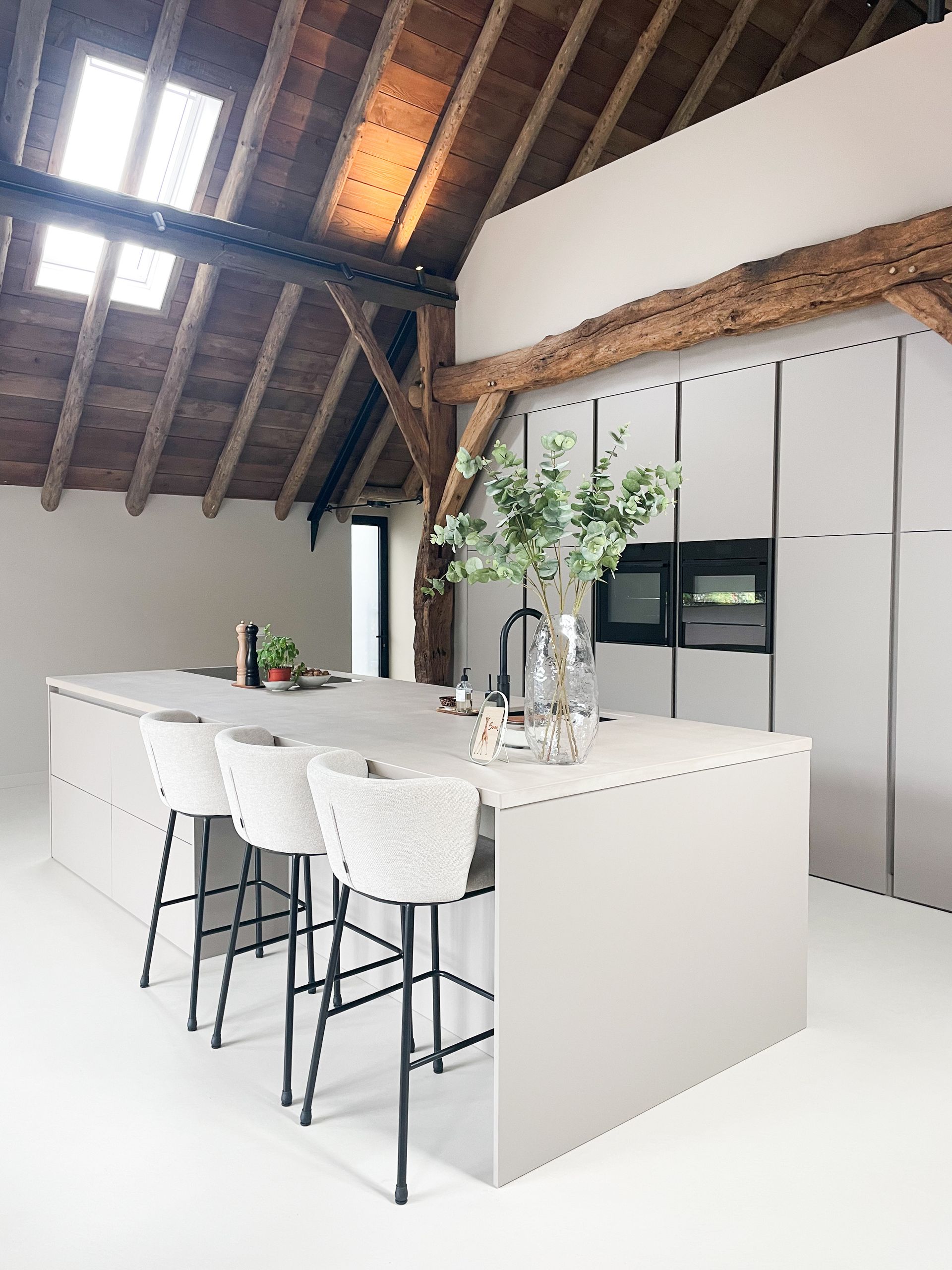 Op de wand hebben we gekozen voor een vergrijsde beige met roze ondertoon. In de keuken komt op de achterwand nog een prachtige handgebakken zellige tegel.